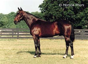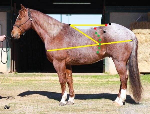 4) A loin no greater than medium in length, so that all the power generated by the haunch can be transferred forward without blowing up the loin. Short is just as okay here as it is in the draft horse. The loin is a freespan (has no ribs to support and add strength), therefore length is its enemy. Strength in this area is of greatest importance, especially if the horse has great pelvic length, which it must have to be fast. We also need broadness across the loin and depth. (Note: A racing fit horse will appear shallower through the loin. This does not necessarily reflect inherent weakness of the loin. Whereas a shallow loin on a non-racing fit horse, a riding horse or a draft horse is immediate cause for concern.)