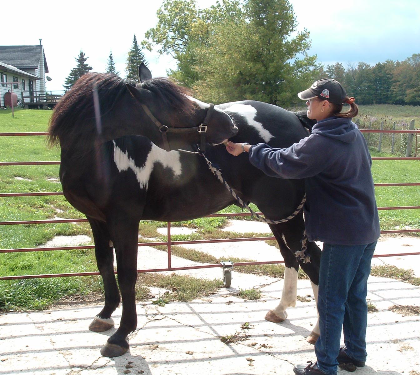 The next stretch is the hardest to execute without having the horse move its feet. The natural tendency is for the horse to spin around because the stretch can be tough for an individual with any sort of tightness in the neck, shoulders or ribcage. Take your time deepening this stretch to encourage the horse to stand still in squareness. The other big cheat in this stretch is head tilting, so beware. One way to encourage straightness is to start the stretch away from the body, then slowly ask the horse to ‘close’ the stretch by bringing the muzzle to the hip. The ultimate goal is that the horse can easily touch nose to point of hip.