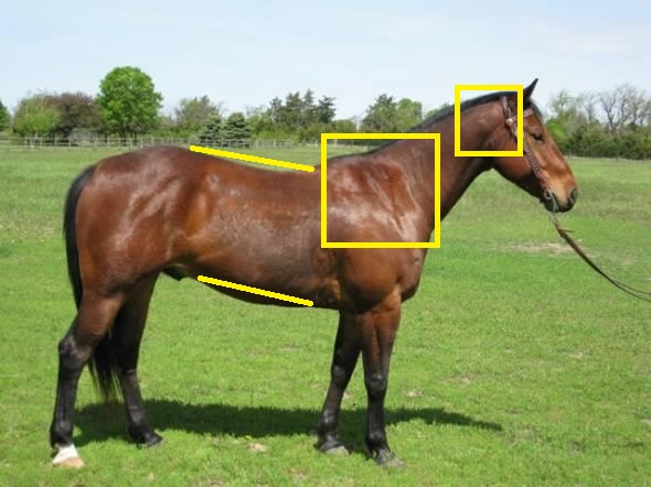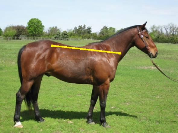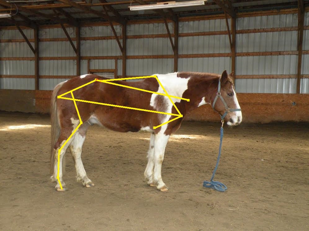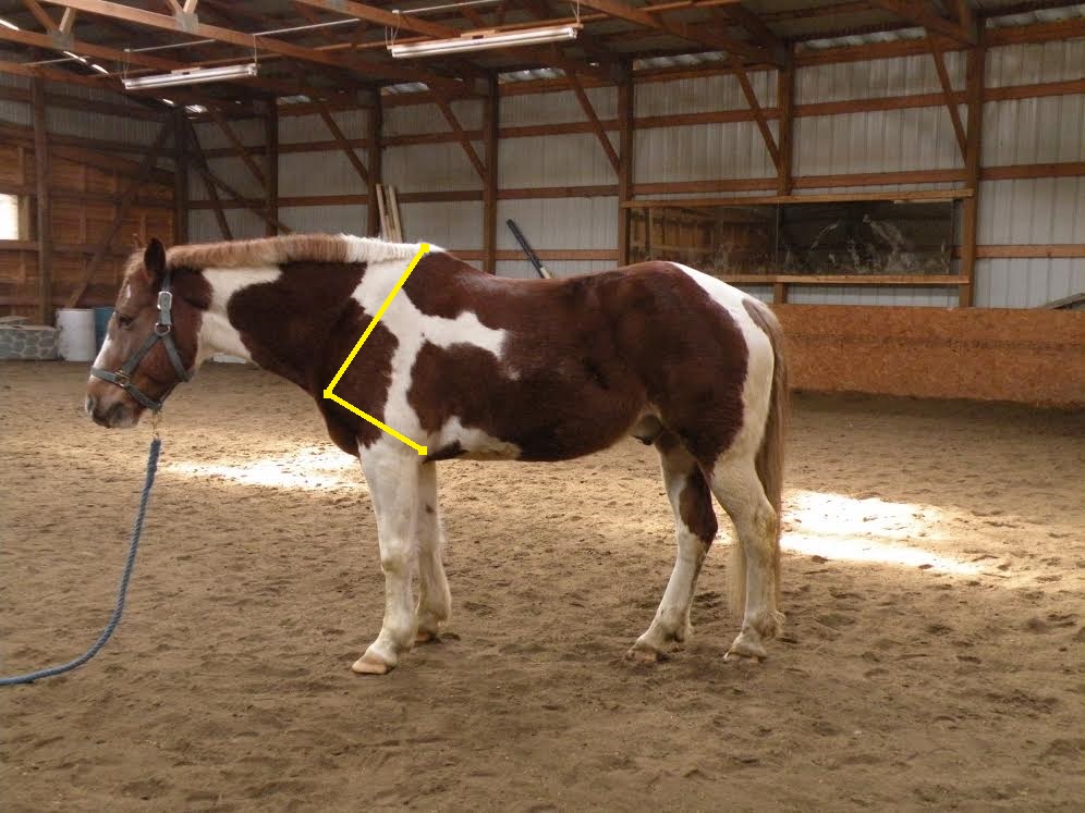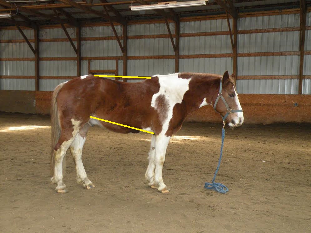 The biggest issue is the lack of conditioning; tight back and loin, sagging weak abdominals, and excess bulk on the base of neck. My first thought was that this horse was gaited because I see nothing else in his conformation that would suggest a natural tendency to move hollow. I believe Duke is standing up hill, so he wouldn’t be as level built as the photo suggests, but also not as straight through the stifle and hock. He is tied in behind the knee, and we might want a less round eye, more almond shaped. We could nitpick a few other things; a little more femur length, a little less tibia length, knee set on a touch lower, but overall he’d be a good riding candidate for your average owner; far easier to ride correctly than most OTTBs or specialized QHs.