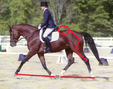 2) The hock of the landed leg is pushing off from behind the horse’s point of buttocks rather than from under the horse’s hip.