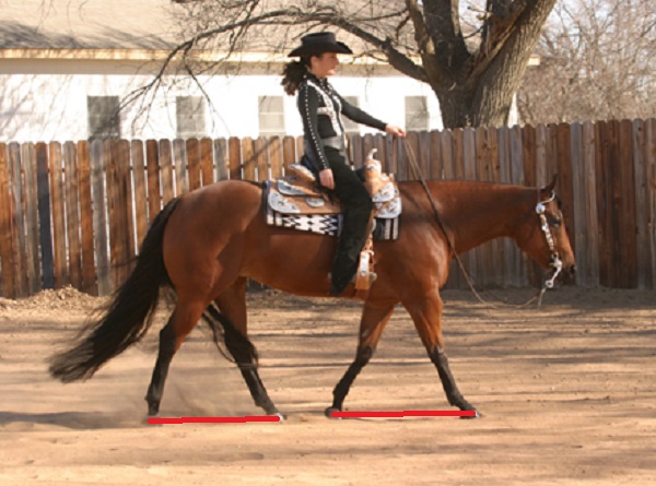 The stride length of the hind legs is identical to that of the front legs. The hind foot is going to land a fraction before the front foot. There is some tightness through the loin and shoulder; the loin should be full and round, the front leg straighter via the knee further back. The tightness causes the near miss between the two feet. If the horse engaged more (rather than swinging the legs a bit like a leg mover vs a back mover), the back would round, the haunch would lower (it’s a bit in the air here), weight would be transferred rearward, and the front end would lift (and loosen). All that would change the timing of the trot and give the horse more room for the deeper hind leg step that would result, without the close call.