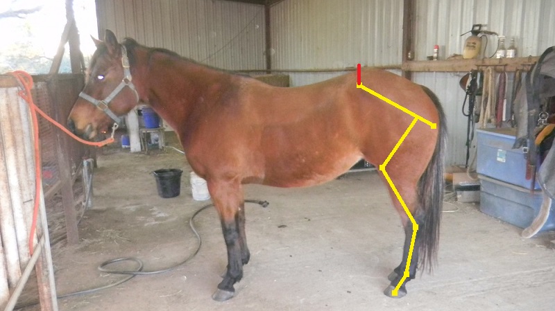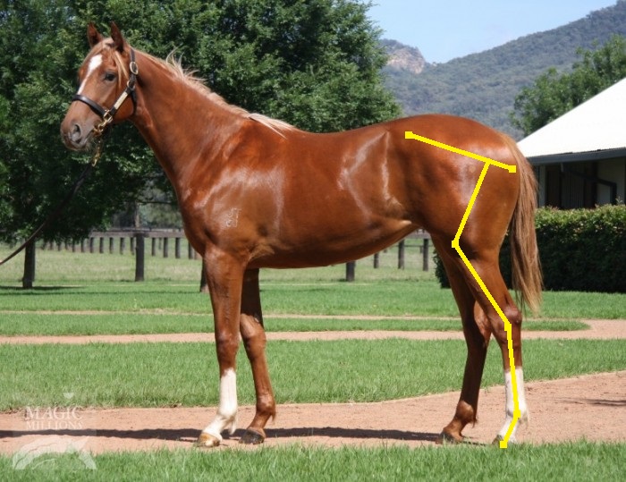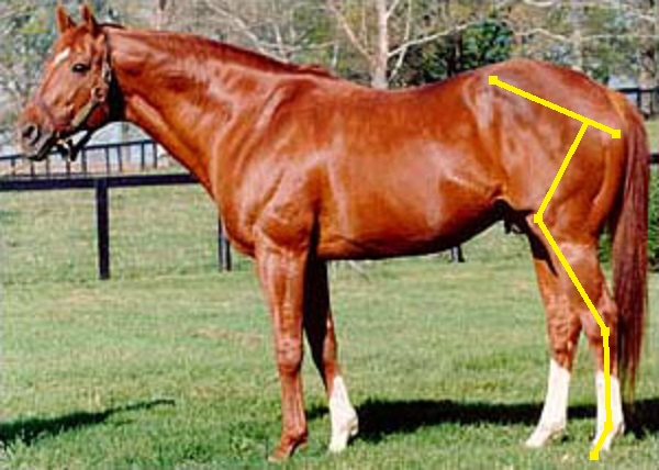 jrga made an excellent suggestion that I also mark the hind leg of the second racehorse in the racing picture to show maximum folding (closed joints) of a properly constructed equine leg as a comparison to the fully extended (open joints) of a properly constructed equine leg. So here is that picture remarked. Of special note is that the pelvis and tibia become parallel, and the femur and cannon bone become parallel as a result of full and proper coiling of the LS joint. It can not happen this way for horses with non-concurrent hind limb angles, or a table top croup.