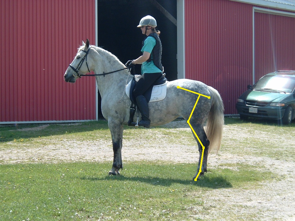 This horse has a steeper pelvis as well, but also the most horizontal femur because she’s standing with the leg too far underneath herself artifically closing the thigh joint. Of course, because of the stay system that also artificially closes the stifle and hock joints. Despite that we can still clearly see that over-angulated hind legs possess more closed joints; 115 degrees for the stifle and 140 degrees for the hock – adjusted 5 degrees higher for a properly aligned stance behind nets 120 and 145 respectively. Horses built like this live with joints perpetuately a bit closed, which comes with its own stresses (and possible injuries – ie. curbs). Opening the joints would relieve those stresses, but because of the stay system the horse would have to flatten its loin along with the opening of those joints, and now you’ve got a hollow horse with trailing hocks.