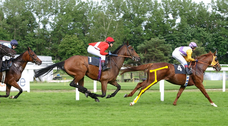 Our post-legged horse has a much steeper pelvis and it’s a good thing as it puts his femur far less vertical than our first horse making a stifle angle of 130 degrees. If he had a more typical pelvic slope he’d be overly open in this joint, but as it stands he’s already got enough problems. His hock angle is a whopping 160 degrees. Note the racehorse below in full hind leg extension (via fully flattened loin and fully opened stifle) only has a fully opened hock angle of 160 degrees. The horse’s hock doesn’t, and isn’t supposed to open to create a perfectly straight leg. That means that if this horse flattens its loin just a little, which has to happen as part of normal striding, his hock will be pressured to hyperextend. The horse will try and protect himself by taking itty, bitty steps behind.
